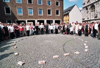 Das Herz des jüdischen Lebens in Köln hat viele Jahrhunderte lang am Rathausplatz geschlagen. (...) Hörbar und begreifbar werden die Botschaften „unter den Steien“n beim „Gedenken zu Beginn“, mit dem der Kirchentag traditionelle die Erinnerung an Verfolgte und Opfer des Naziregimes pflegt. (...) Der Musiker Bernhard König mit vielen Teilnehmern des Projekts „Neue Musik“ und der Publizist Günther Bernd Ginzel haben Menschen unterschiedlicher Herkunft ermuntert, an der Spurensuche teilzunehmen (...). Erinnerungen von Zeitzeugen werden vorgelesen, musikalisch oder szenisch dargestellt. Mundharmonikaspiel, das eine aus Köln geflohene Jüdin noch als alte Frau in Israel an ihre Kinderzeit erinnert hat, oder Karnevalslieder, die Verfolgte und Vertriebene immer mit schönen Erlebnissen in Köln verbunden haben, mischen sich in die Schilderung der Vernichtung. Dazu klingen die Glocken des Ratsturmes, aus den Fenstern erschallen Saxophontöne. (...) Geistig behinderte Mitglieder des Ensembles Maul&Trommel fassen das Unsagbare in Töne.