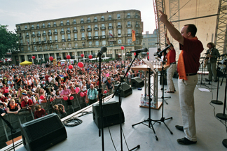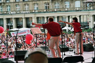 Beim Kirchentag selbst konnten die Ergebnisse dieses abenteuerlichen Prozesses auf vielfältige Weise erlebt werden: In der „Halle der Kirchenmusik“ und in der Straßenbahn. Beim „Offenen Singen“ und im Open-Air-Konzert. Oder, gleich zu Beginn: In der Eröffnungsveranstaltung des Kirchentags auf dem Kölner Rathausplatz.