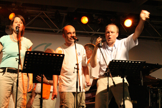 Und jetzt alle: Pfeifen auf die Globalisierung! Die Sängerin vom Netzwerk Neue Töne macht es vor: Erst ein tiefes G, dann das G acht Töne höher: G8 eben. Dum – dimdim! Jetzt den Politikern Dampf machen: Tsch! Schließlich der Pfiff! Echt kritisch kommt das rüber, und wer von den geschätzten 10.000 Christenmesnchen genauso über den g-8-Gipfel denkt, macht mit.