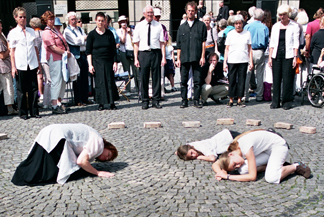 Die rund 200 Kirchentagsbesucher, die die anderhalbstündige Inszenierung aus Respekt vor den Ermordeten im Stehen erleben, sind von der sinnlichen Veranstaltung aus Wort, Gestik und Ton sehr berührt, das sieht man ihren Gesichtern an.