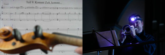 Die eigens für diese Aufführung komponierte experimentelle Bläsermusik bewegt sich durch den gesamten Raum, umkreist das Publikum und wird ergänzt durch einen vielstimmigen Megaphon-Chor und Improvisationen für Geige und Akkordeon.